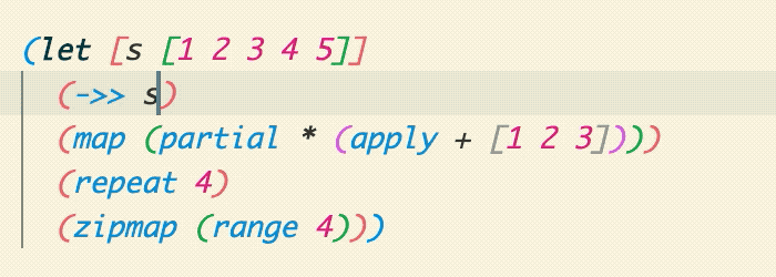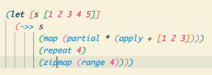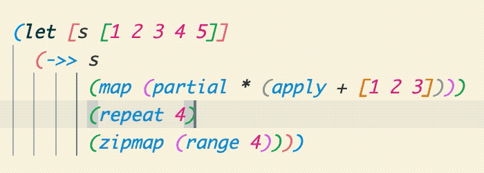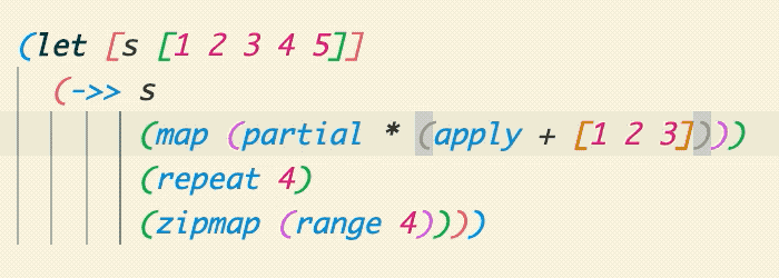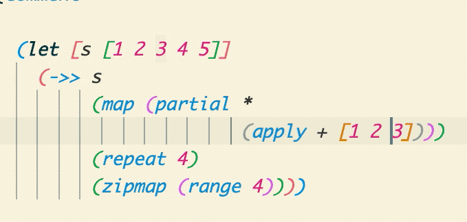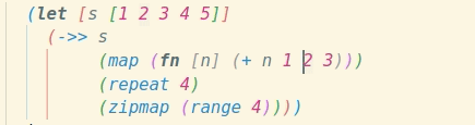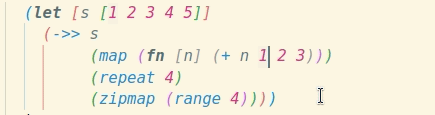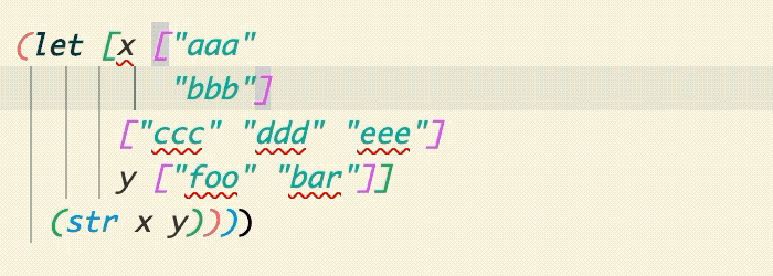 When dragging forms inside maps and binding boxes, such as with let, for, binding, etcetera, it often makes most sense to drag each binding as a pair. And this is what Calva will do. Like so: